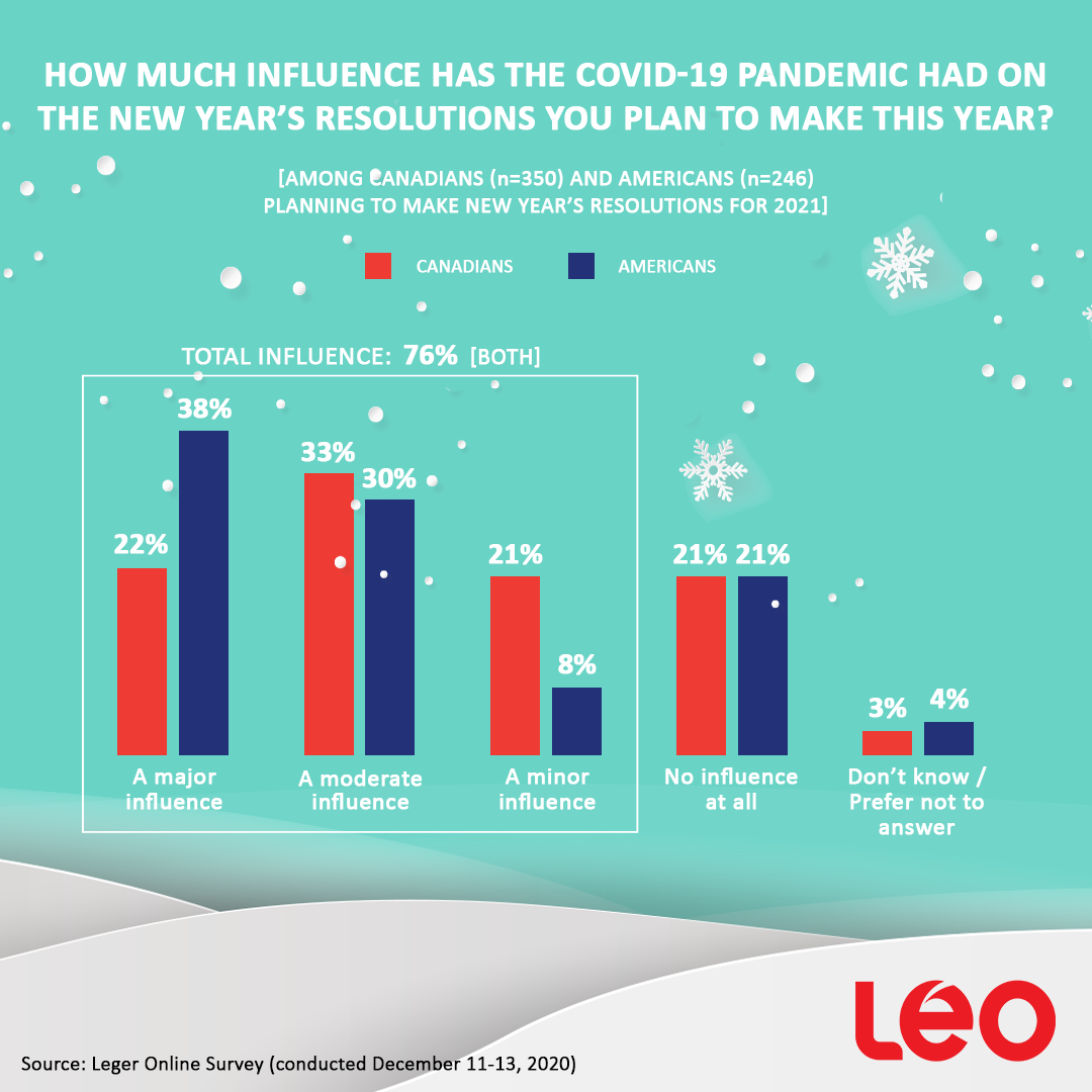 - 22% of Canadians and 38% of Americans say the pandemic had a major influence on the resolutions they are planning