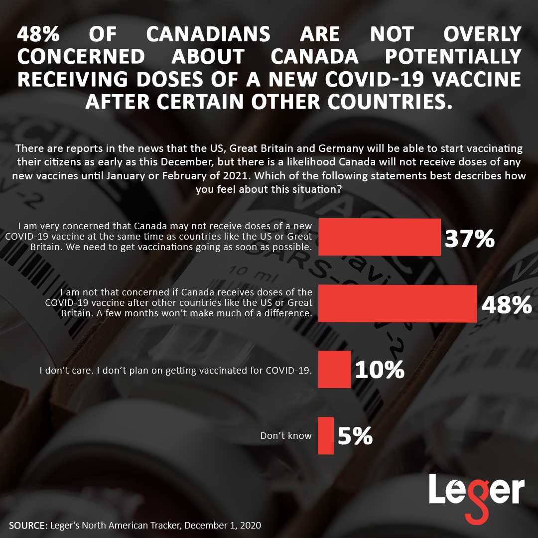 - 48% of Canadians are not overly concerned about Canada potentially receiving doses of a new COVID-19 vaccine after certain other countries, and feel that a few months won’t make much of a difference. In contrast, 37% are very concerned that Canada may not receive doses of a new COVID-19 vaccine at the same time as certain other countries, and feel we need to get vaccinations started as soon as possible.