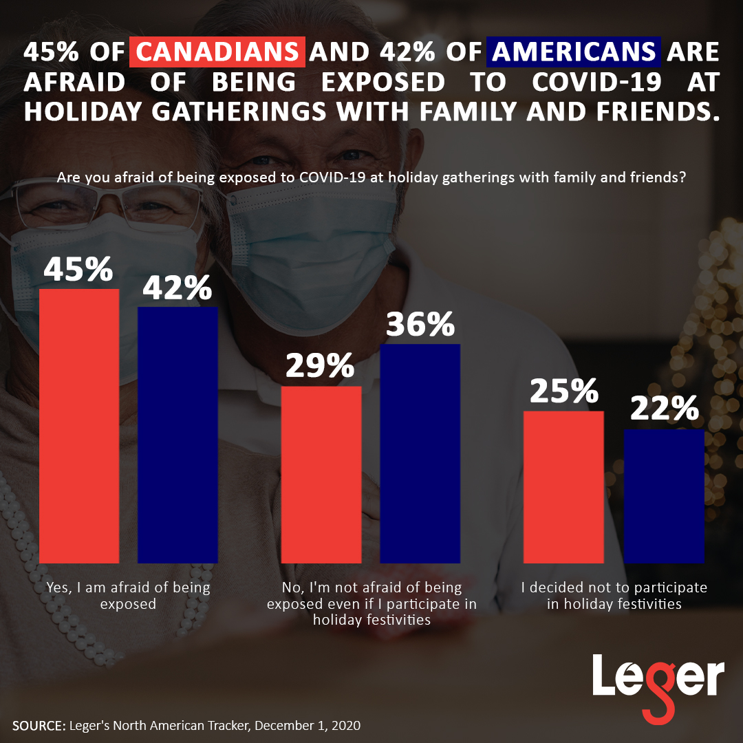 - 45% of Canadians and 42% of Americans are afraid of being exposed to COVID-19 at holiday gatherings with family and friends.