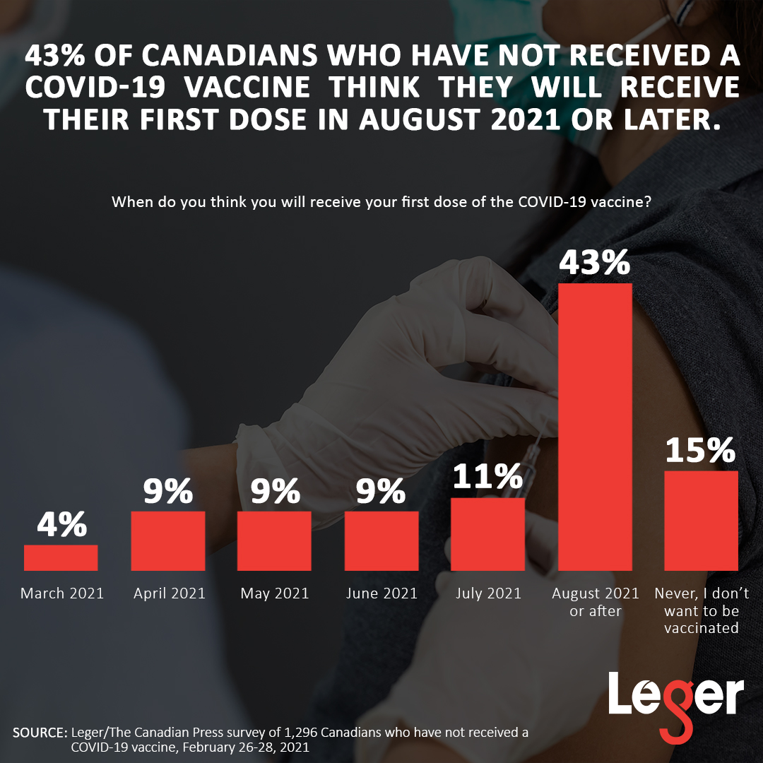 - 43% of Canadians who have not received a COVID-19 vaccine think they will receive their first dose in August 2021 or later.