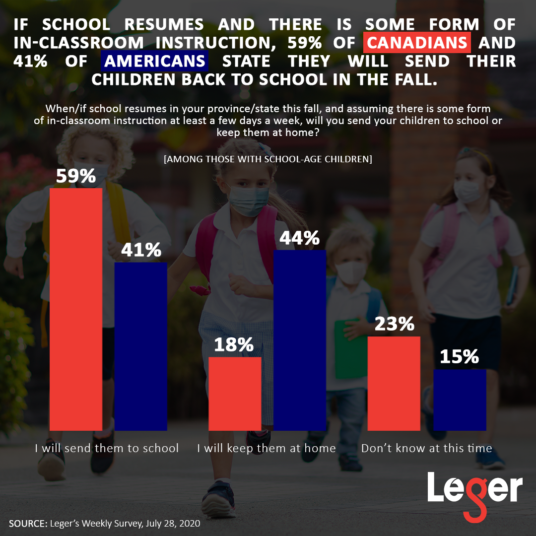 - If school resumes and there is some form of in-classroom instruction, 59% of Canadians and 41% of Americans state they will send their children back to school in the fall.