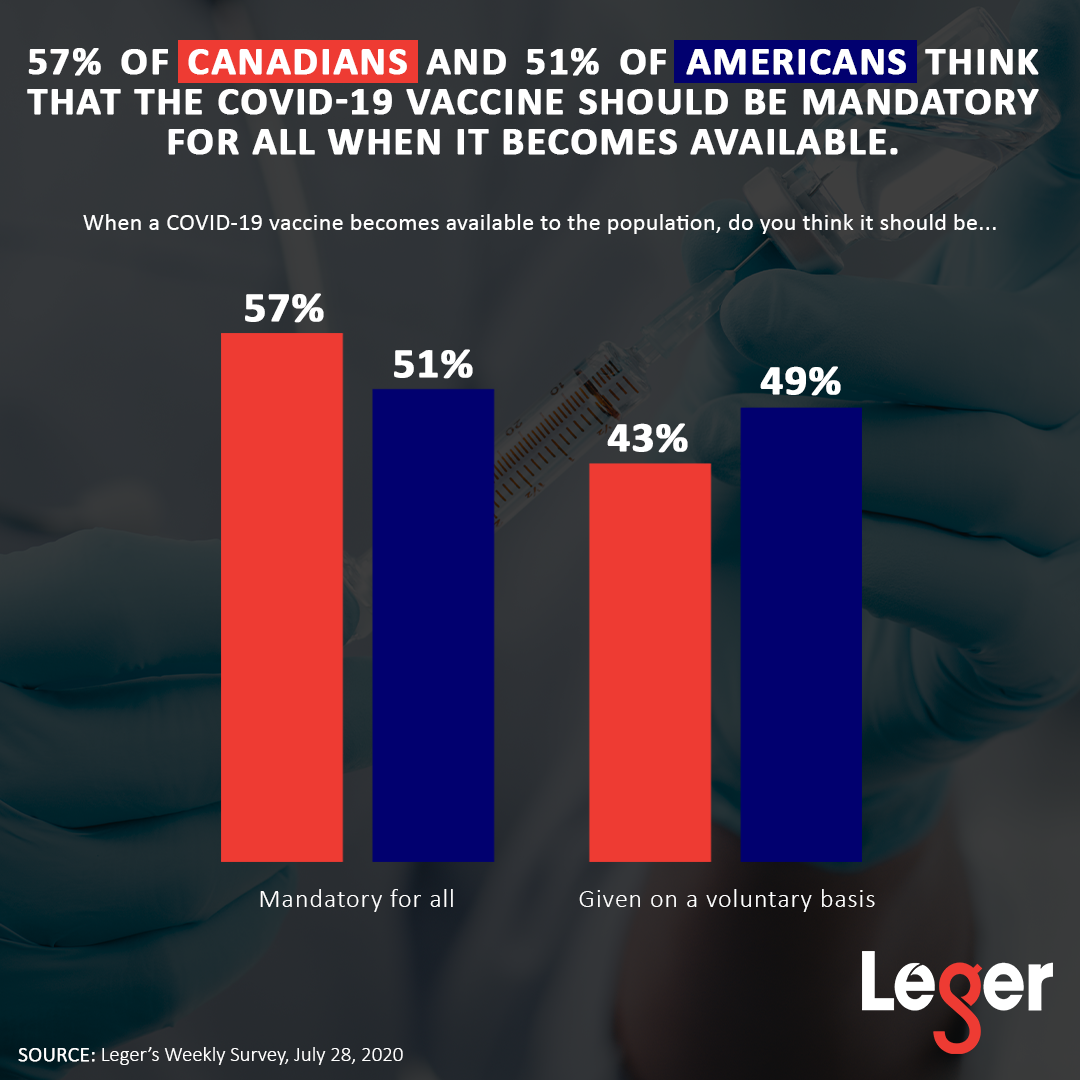 - 57% of Canadians and 51% of Americans think that the COVID-19 vaccine should be mandatory for all when it becomes available.