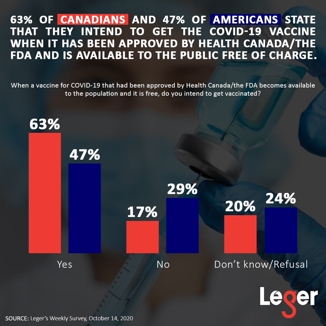 - 63% of Canadians and 47% of Americans state that they intend to get the COVID-19 vaccine when it has been approved by Health Canada/the FDA and is available to the public free of charge.