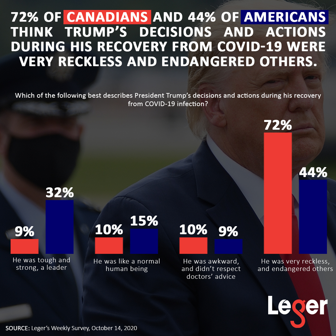 - 72% of Canadians and 44% of Americans think Trump’s decisions and actions during his recovery from COVID-19 were very reckless and endangered others.