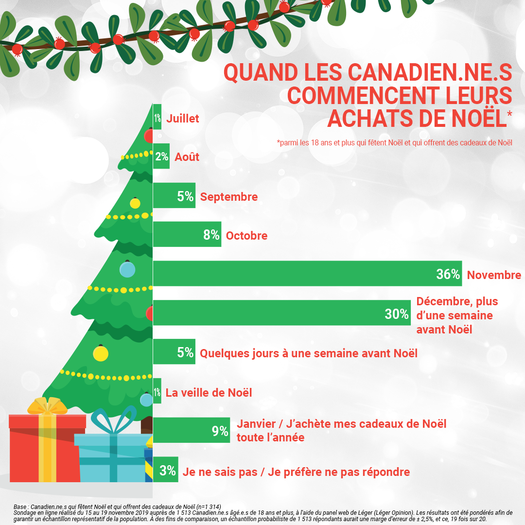 Nous avons demandé aux Canadiens qui fêtent Noël et qui offrent des cadeaux pour l’occasion à quel moment ils commençaient leur magasinage de Noël.