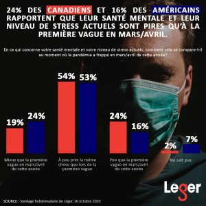 - 24% des Canadiens et 16% des Américains rapportent que leur santé mentale et leur niveau de stress actuels sont pires qu’à la première vague en mars/avril.