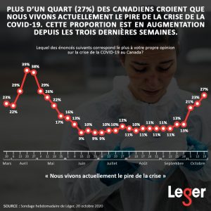 - Plus d’un quart (27%) des Canadiens croient que nous vivons actuellement le pire de la crise de la COVID-19. Cette proportion est en augmentation depuis les trois dernières semaines.