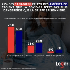 - 25% des Canadiens et 37% des Américains croient que la COVID-19 n’est pas plus dangereuse que la grippe saisonnière.
