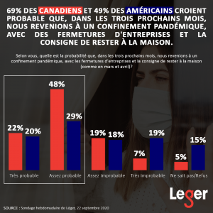 - 69% des Canadiens et 49% des Américains croient probable que, dans les trois prochains mois, nous revenions à un confinement pandémique, avec des fermetures d’entreprises et la consigne de rester à la maison.