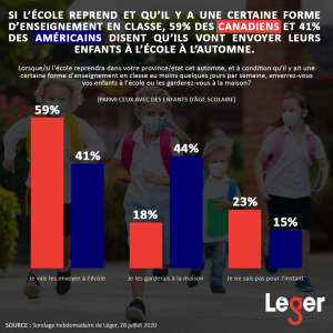 - Si l’école reprend et qu’il y a une certaine forme d’enseignement en classe, 59% des Canadiens et 41% des Américains disent qu’ils vont envoyer leurs enfants à l’école à l’automne.
