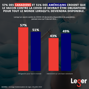 - 57% des Canadiens et 51% des Américains croient que le vaccin contre la COVID-19 devrait être obligatoire pour tout le monde lorsqu’il deviendra disponible.