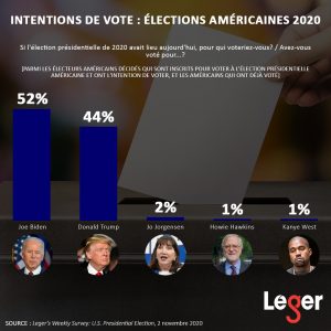 - Parmi les répondants inscrits pour voter à l’élection présidentielle américaine et qui ont l’intention de voter (ou qui ont déjà voté), 52% disent qu’ils ont/vont voter pour Joe Biden, et 44% disent qu’ils ont/vont voter pour Donald Trump.