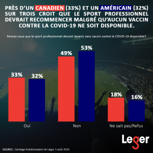 - Près d’un Canadien (33%) et un Américain (32%) sur trois croit que le sport professionnel devrait recommencer malgré qu’aucun vaccin contre la COVID-19 ne soit disponible.