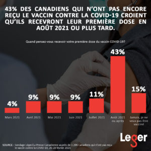 - 43% des Canadiens qui n’ont pas encore reçu le vaccin contre la COVID-19 croient qu’ils recevront leur première dose en août 2021 ou plus tard.